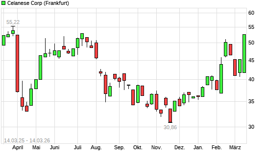Mit dem Anstieg auf 52,60 EUR hat die Celanese-Aktie (ISIN US1508701034) am 13.03.2026 ein neues 6-Monats-Hoch erreicht und damit den Kurs vom 12.02.2026 eingestellt.