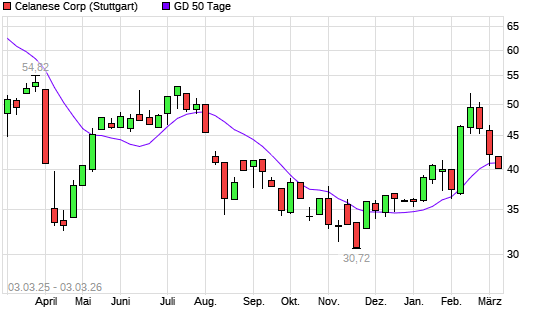Mit dem Rücksetzer auf 40,78 EUR hat die Celanese-Aktie am 02.03.2026 die 50-Tage-Linie nach unten gekreuzt.