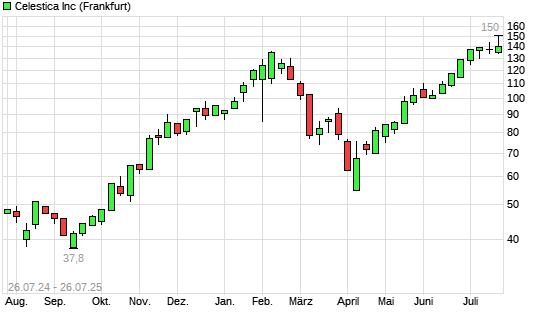 Mit dem Anstieg auf 140,00 EUR hat die Celestica-Aktie (ISIN CA15101Q2071) am 25.07.2025 ein neues All-Time-High erreicht und damit den Kurs vom 11.07.2025 eingestellt.