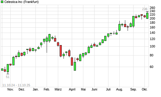 Mit dem Anstieg auf 229,00 EUR hat die Celestica-Aktie (ISIN CA15101Q2071) am 10.10.2025 ein neues All-Time-High erreicht und damit den Kurs vom 09.10.2025 eingestellt.