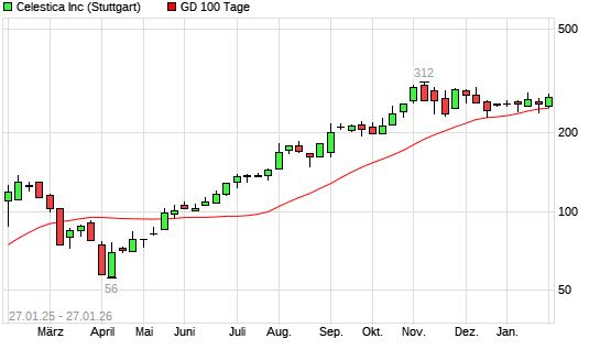 Mit dem Anstieg auf 261,00 EUR hat die Celestica-Aktie am 26.01.2026 die 100-Tage-Linie nach oben gekreuzt.