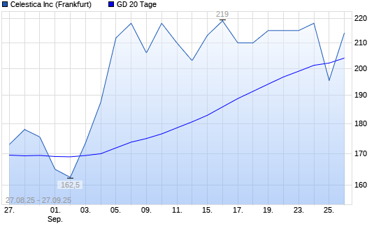 Mit dem Anstieg auf 214,00 EUR hat die Celestica-Aktie am 26.09.2025 die 20-Tage-Linie nach oben gekreuzt.
