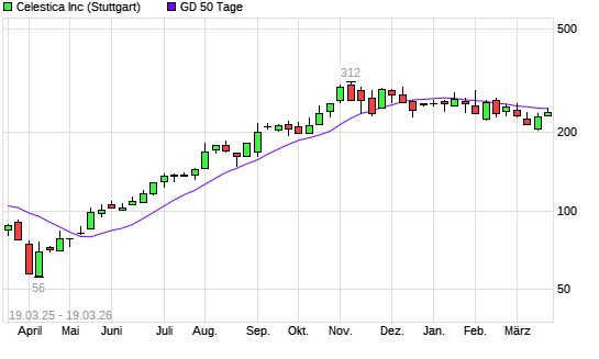 Mit dem Anstieg auf 248,00 EUR hat die Celestica-Aktie am 18.03.2026 die 50-Tage-Linie nach oben gekreuzt.
