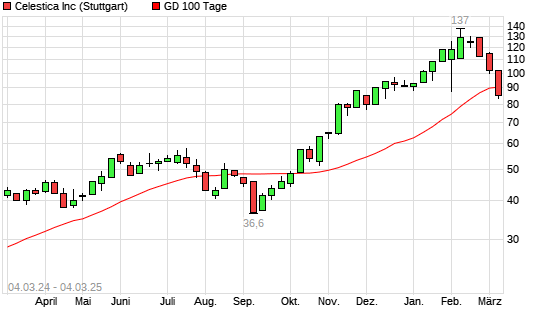 Mit dem Rücksetzer auf 91,00 EUR hat die Celestica-Aktie am 03.03.2025 die 100-Tage-Linie nach unten gekreuzt.