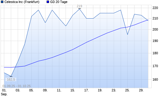 Mit dem Rücksetzer auf 208,00 EUR hat die Celestica-Aktie am 30.09.2025 die 20-Tage-Linie nach unten gekreuzt.