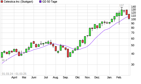 Mit dem Rücksetzer auf 102,00 EUR hat die Celestica-Aktie am 28.02.2025 die 50-Tage-Linie nach unten gekreuzt.