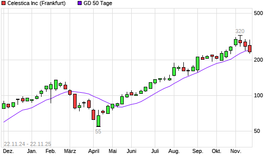 Mit dem Rücksetzer auf 235,00 EUR hat die Celestica-Aktie am 21.11.2025 die 50-Tage-Linie nach unten gekreuzt.