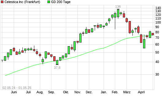 Mit dem Rücksetzer auf 75,00 EUR hat die Celestica-Aktie am 30.04.2025 die 200-Tage-Linie nach unten gekreuzt.Die Celestica-Aktie befand sich seit dem 23.04.2025 im langfristigen Abwärtstrend ...weiterlesen