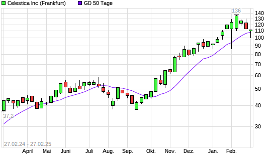 Mit dem Anstieg auf 111,00 EUR hat die Celestica-Aktie am 26.02.2025 die 50-Tage-Linie nach oben gekreuzt.Die Celestica-Aktie befindet sich seit dem 18.09.2024 im langfristigen Aufwärtstrend ...weiterlesen