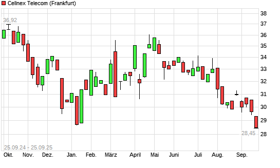 Mit dem Rücksetzer auf 28,56 EUR hat die Cellnex Telecom SA-Aktie (ISIN ES0105066007) am 24.09.2025 ein neues 12-Monats-Tief erreicht und damit den Kurs vom 09.01.2025 eingestellt.