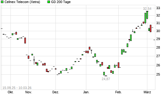 Mit dem Rücksetzer auf 28,72 EUR hat die Cellnex Telecom SA-Aktie am 09.03.2026 die 200-Tage-Linie nach unten gekreuzt.