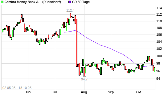 Mit dem Rücksetzer auf 95,80 EUR hat die Cembra Money Bank AG-Aktie am 17.10.2025 die 50-Tage-Linie nach unten gekreuzt.