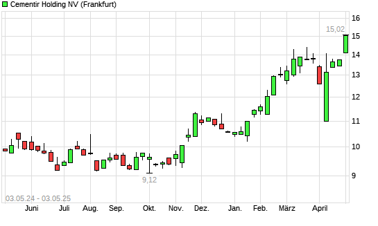 Mit dem Anstieg auf 14,92 EUR hat die Cementir Holding-Aktie (ISIN NL0013995087) am 02.05.2025 ein neues All-Time-High erreicht und damit den Kurs vom 01.05.2025 eingestellt.