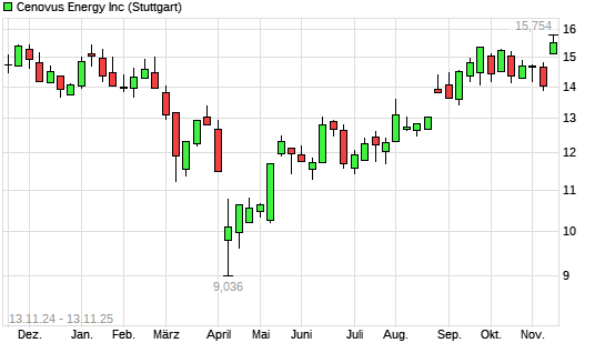 Mit dem Anstieg auf 15,63 EUR hat die Cenovus Energy-Aktie (ISIN CA15135U1093) am 12.11.2025 ein neues 12-Monats-Hoch erreicht und damit den Kurs vom 21.11.2024 eingestellt.