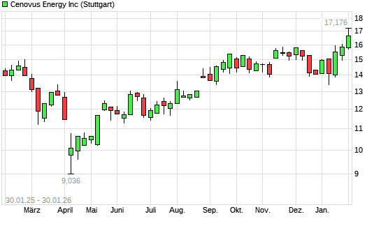 Mit dem Anstieg auf 16,76 EUR hat die Cenovus Energy-Aktie (ISIN CA15135U1093) am 29.01.2026 ein neues 12-Monats-Hoch erreicht und damit den Kurs vom 27.01.2026 eingestellt.