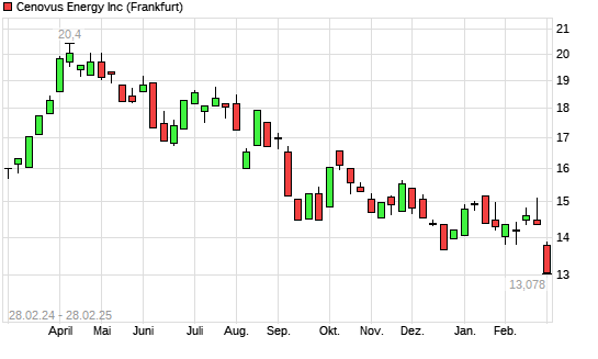 Mit dem Rücksetzer auf 13,19 EUR hat die Cenovus Energy-Aktie (ISIN CA15135U1093) am 27.02.2025 ein neues 12-Monats-Tief erreicht und damit den Kurs vom 26.02.2025 eingestellt.