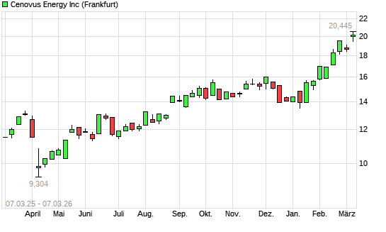 Mit dem Anstieg auf 20,12 EUR hat die Cenovus Energy-Aktie (ISIN CA15135U1093) am 06.03.2026 ein neues 3-Jahres-Hoch erreicht und damit den Kurs vom 25.04.2024 eingestellt.