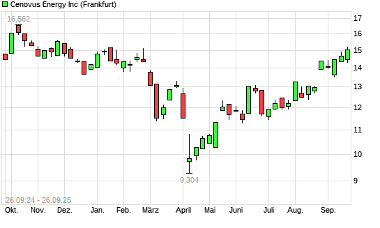 Mit dem Anstieg auf 15,20 EUR hat die Cenovus Energy-Aktie (ISIN CA15135U1093) am 25.09.2025 ein neues 6-Monats-Hoch erreicht und damit den Kurs vom 18.09.2025 eingestellt.