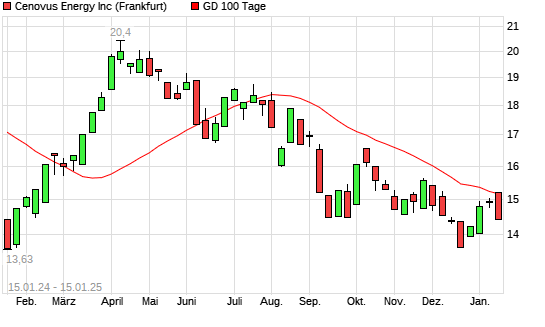 Mit dem Rücksetzer auf 14,75 EUR hat die Cenovus Energy-Aktie am 14.01.2025 die 100-Tage-Linie nach unten gekreuzt.