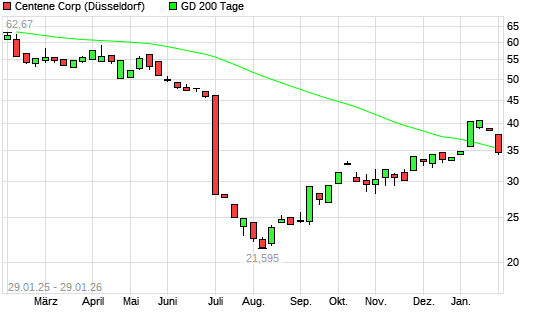 Mit dem Rücksetzer auf 34,70 EUR hat die Centene-Aktie am 28.01.2026 die 200-Tage-Linie nach unten gekreuzt.