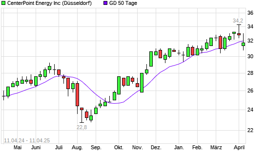 Mit dem Anstieg auf 32,20 EUR hat die CenterPoint Energy-Aktie am 10.04.2025 die 50-Tage-Linie nach oben gekreuzt.
