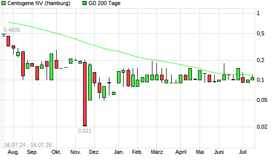 Mit dem Rücksetzer auf 0,11 EUR hat die Centogene-Aktie am 15.07.2025 die 200-Tage-Linie nach unten gekreuzt.