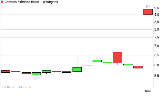 Mit dem Anstieg auf 9,95 EUR hat die Centrais-Aktie (ISIN BRELETACNOR6) am 04.02.2026 ein neues 5-Jahres-Hoch erreicht und damit den Kurs vom 07.11.2022 eingestellt.