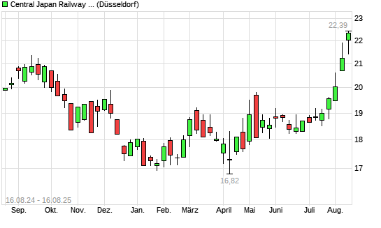 Mit dem Anstieg auf 22,41 EUR hat die Central Japan Railway-Aktie (ISIN JP3566800003) am 15.08.2025 ein neues 12-Monats-Hoch erreicht und damit den Kurs vom 14.08.2025 eingestellt.
