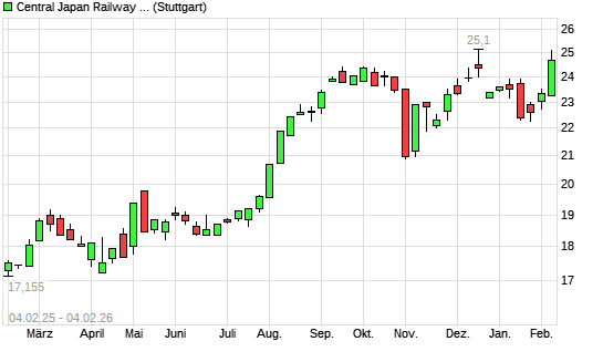 Mit dem Anstieg auf 24,87 EUR hat die Central Japan Railway-Aktie (ISIN JP3566800003) am 03.02.2026 ein neues 3-Jahres-Hoch erreicht und damit den Kurs vom 09.10.2025 eingestellt.