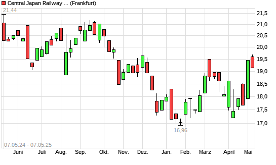 Mit dem Anstieg auf 19,69 EUR hat die Central Japan Railway-Aktie (ISIN JP3566800003) am 06.05.2025 ein neues 6-Monats-Hoch erreicht und damit den Kurs vom 29.11.2024 eingestellt.