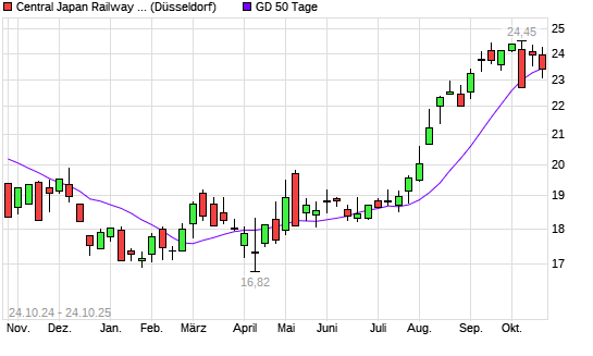 Mit dem Anstieg auf 23,68 EUR hat die Central Japan Railway-Aktie am 23.10.2025 die 50-Tage-Linie nach oben gekreuzt.
