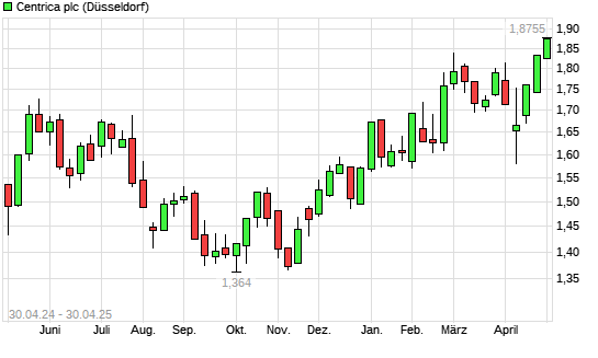 Mit dem Anstieg auf 1,88 EUR hat die Centrica-Aktie (ISIN GB00B033F229) am 29.04.2025 ein neues 12-Monats-Hoch erreicht und damit den Kurs vom 28.04.2025 eingestellt.