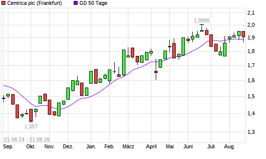 Mit dem Rücksetzer auf 1,87 EUR hat die Centrica-Aktie am 20.08.2025 die 50-Tage-Linie nach unten gekreuzt.