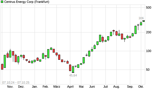 Mit dem Anstieg auf 306,00 EUR hat die Centrus Energy-Aktie (ISIN US15643U1043) am 06.10.2025 ein neues 10-Jahres-Hoch erreicht und damit den Kurs vom 03.10.2025 eingestellt.