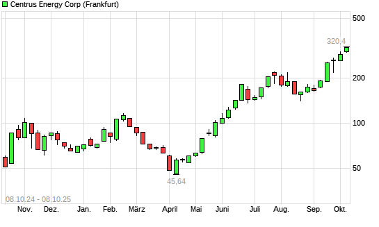 Mit dem Anstieg auf 320,40 EUR hat die Centrus Energy-Aktie (ISIN US15643U1043) am 07.10.2025 ein neues 10-Jahres-Hoch erreicht und damit den Kurs vom 06.10.2025 eingestellt.