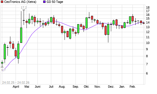 Mit dem Rücksetzer auf 13,80 EUR hat die CeoTronics-Aktie am 23.02.2026 die 50-Tage-Linie nach unten gekreuzt.