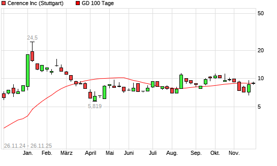 Mit dem Rücksetzer auf 8,66 EUR hat die Cerence-Aktie am 25.11.2025 die 100-Tage-Linie nach unten gekreuzt.