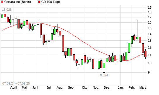 Mit dem Rücksetzer auf 10,89 EUR hat die Certara-Aktie am 06.03.2025 die 100-Tage-Linie nach unten gekreuzt.