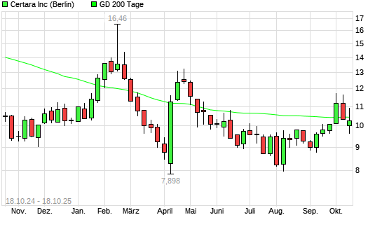 Mit dem Rücksetzer auf 10,14 EUR hat die Certara-Aktie am 17.10.2025 die 200-Tage-Linie nach unten gekreuzt.