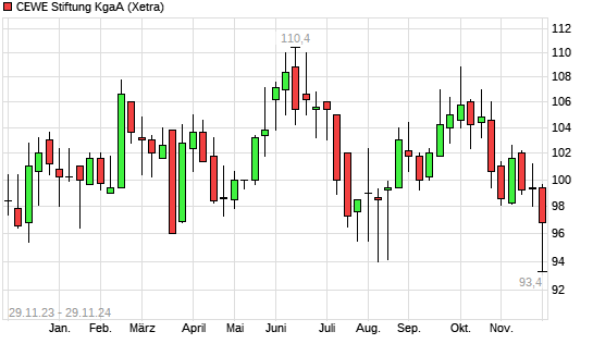 Mit dem Rücksetzer auf 93,50 EUR hat die Cewe Stiftung-Aktie (ISIN DE0005403901) am 28.11.2024 ein neues 12-Monats-Tief erreicht und damit den Kurs vom 05.08.2024 eingestellt.