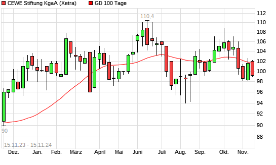 Mit dem Anstieg auf 101,80 EUR hat die Cewe Stiftung-Aktie am 14.11.2024 die 100-Tage-Linie nach oben gekreuzt.