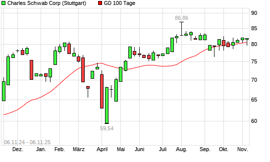 Mit dem Anstieg auf 81,80 EUR hat die Charles Schwab-Aktie am 05.11.2025 die 100-Tage-Linie nach oben gekreuzt.