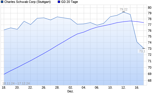 Mit dem Rücksetzer auf 75,56 EUR hat die Charles Schwab-Aktie am 16.12.2024 die 20-Tage-Linie nach unten gekreuzt.