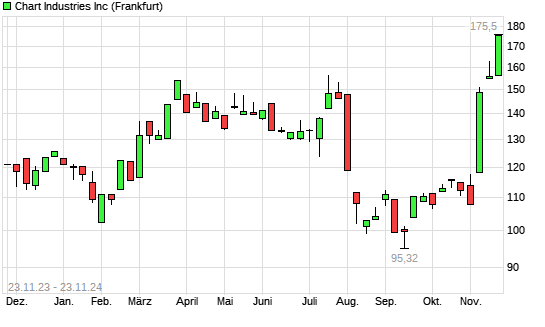 Mit dem Anstieg auf 167,05 EUR hat die Chart Industries-Aktie (ISIN US16115Q3083) am 22.11.2024 ein neues 12-Monats-Hoch erreicht und damit den Kurs vom 14.11.2024 eingestellt.