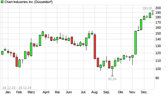 Mit dem Anstieg auf 190,80 EUR hat die Chart Industries-Aktie (ISIN US16115Q3083) am 17.12.2024 ein neues 12-Monats-Hoch erreicht und damit den Kurs vom 13.12.2024 eingestellt.