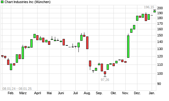 Mit dem Anstieg auf 196,65 EUR hat die Chart Industries-Aktie (ISIN US16115Q3083) am 07.01.2025 ein neues 12-Monats-Hoch erreicht und damit den Kurs vom 06.01.2025 eingestellt.