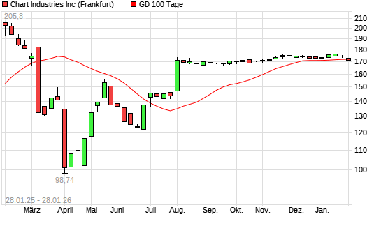Mit dem Rücksetzer auf 172,35 EUR hat die Chart Industries-Aktie am 27.01.2026 die 100-Tage-Linie nach unten gekreuzt.