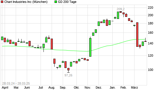 Die Chart Industries-Aktie befand sich seit dem 25.03.2025 im langfristigen Aufwärtstrend und hat in diesem Zeitraum -1,42% an Wert verloren.