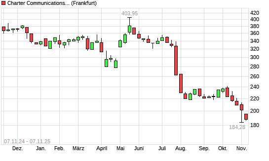 Mit dem Rücksetzer auf 186,86 EUR hat die Charter Communications-Aktie (ISIN US16119P1084) am 06.11.2025 ein neues 5-Jahres-Tief erreicht und damit den Kurs vom 04.11.2025 eingestellt.