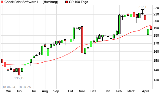 Mit dem Rücksetzer auf 189,90 EUR hat die Check Point Software-Aktie am 17.04.2025 die 100-Tage-Linie nach unten gekreuzt.